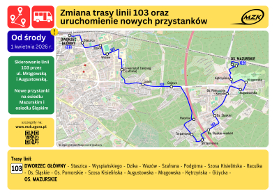 Minibus linii 103 będzie kursował na trasie Os. Mazurskie – Dworzec Główny z dodatkowym przejazdem przez ulicę Mrągowską i Augustowską, gdzie powstaną nowe przystanki.