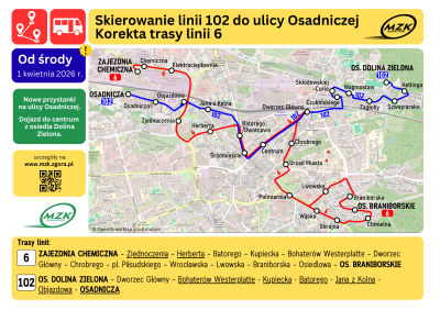 Linia nr 102 przejmie część trasy dotychczas obsługiwanej przez linię nr 6, zapewniając bezpośrednie połączenie ze Śródmieściem, Centrum oraz Dworcem Głównym dla mieszkańców osiedla Dolina Zielona oraz ul. Osadniczej, Objazdowej i Jana z Kolna. Nie będzie już obsługiwała Szpitala Uniwersyteckiego.